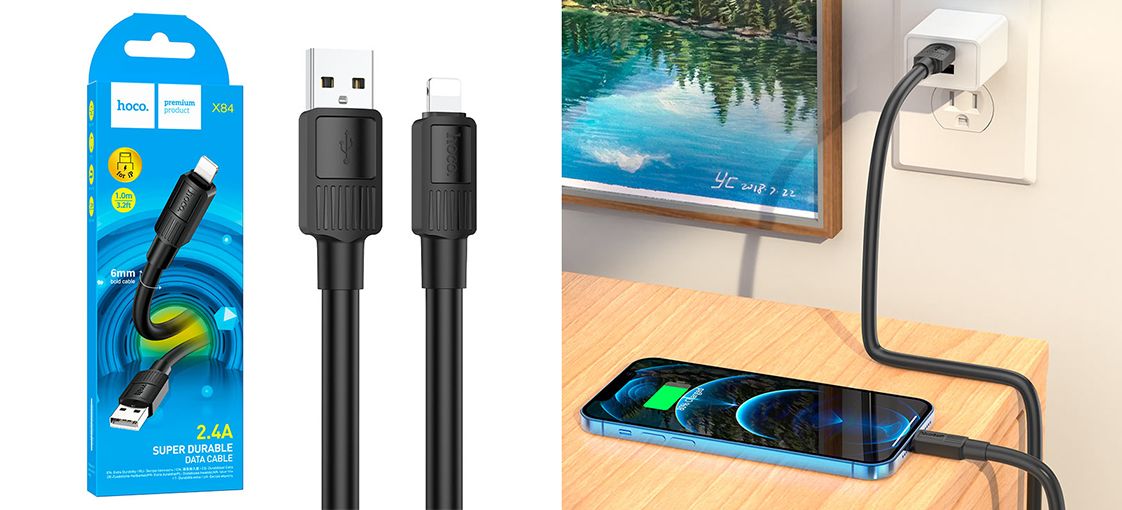 USB кабель Hoco X84 Lightning 2.4A 1m чорний чудове рішення для зарядки та синхронізації даних ваших гаджетів. Шнур тактильно приємний, виконаний із якісних зносостійких матеріалів. Комфортна довжина кабелю 1m. Кабель USB Hoco X84 дозволяє не тільки заряджати ваші пристрої, а й передавати дані на комп'ютер чи смартфон.