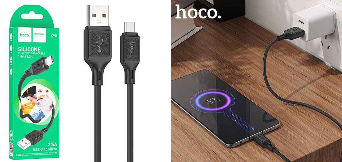 HOCO X90 Cool silicone charging data cable for Micro — кабель для заряджання акумулятора, передачі даних та синхронізації мобільних пристроїв з роз'ємом Micro. Багатошарова конструкція кабелю з обплетенням із силікону та наконечники з алюмінію забезпечують стійкість до розривів та розтягувань та гарантують надійну роботу аксесуара протягом тривалого періоду часу.