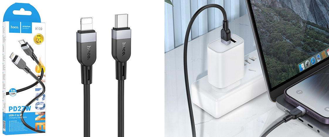 Кабель Hoco X109 - ідеально підходить для тих, хто шукає надежний аксесуар для швидкої зарядки та синхронізації даних з пристроями Apple через порт Lightning. Завдяки підтримці потужності до 27W, цей кабель забезпечує швидку та ефективну зарядку iPhone та інших пристроїв Apple. Придатний для використання зі всіма сучасними зарядними адаптерами із портом Type-C, що підтримують PD (Power Delivery)