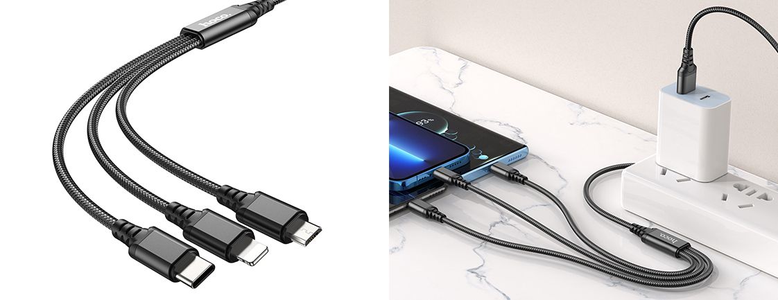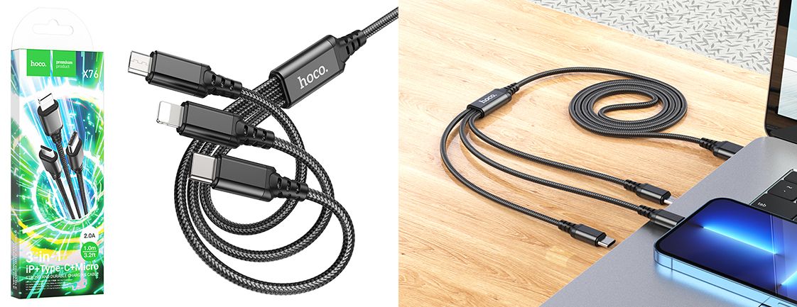 Кабель Hoco X76 3 в 1 USB до Type-C+Lightning+MicroUSB (1m) забезпечує широку сумісність із пристроями різних типів, а також одночасну зарядку до трьох гаджетів завдяки наявності конекторів Lightning, MicroUSB та Type-C. На звороті розташований коннектор USB – широкопоширений тип в мережевих адаптерах та комп'ютерах. Варто зазначити, що передача даних не підтримується.
