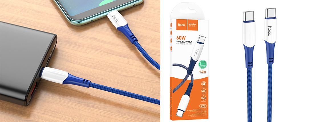 Кабель Hoco x70 Ferry 60W Type-C to Type-C (1м) – якісний та міцний зносостійкий кабель. Також шнур підтримує синхронізацію даних із комп'ютером. Дана модель забезпечує швидку зарядку QC 3.0 та PD2.0 та працює з максимальною силою струму 3А. Кабель має довжину 1 м і покритий щільним нейлоновим обплетенням.