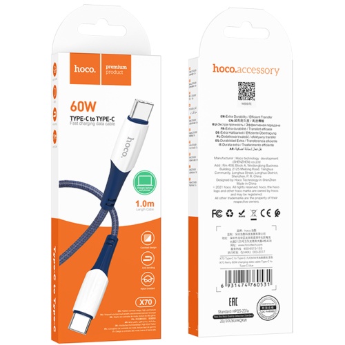 Кабель Hoco X70 Ferry (PD) Type-C - Type-C 60W 3A/1m (Синій)