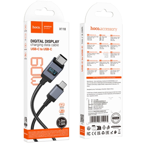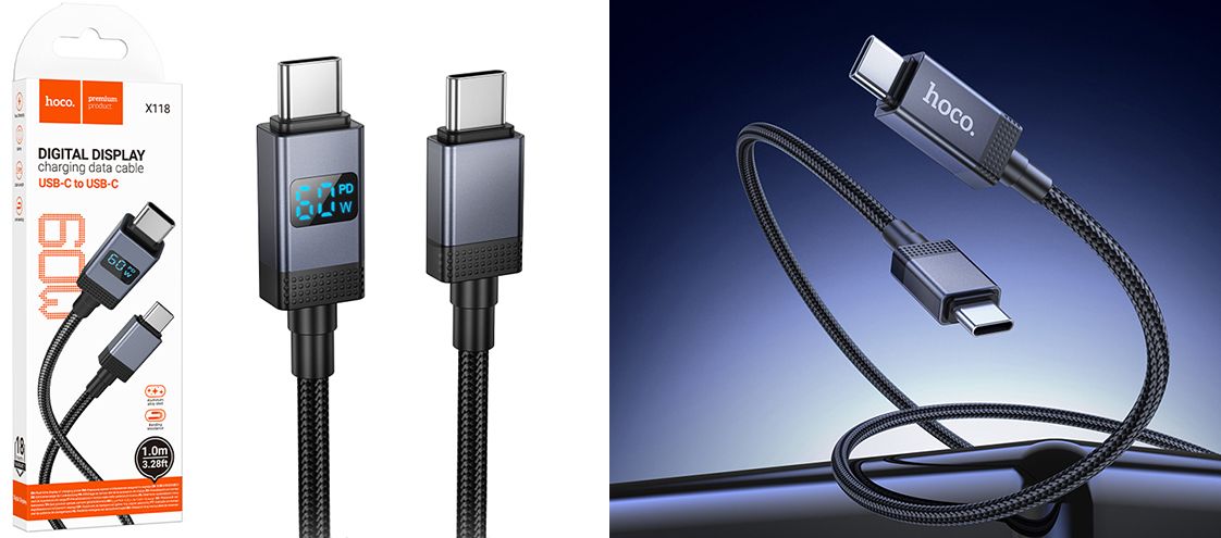 Кабель Hoco X118 60W Type-C to Type-C – це стильний, міцний та технологічний аксесуар, створений для швидкої зарядки та передачі даних на високому рівні. Його головна особливість – вбудований LED-дисплей, який у реальному часі відображає потужність заряджання, дозволяючи контролювати процес та бути впевненим у ефективності.