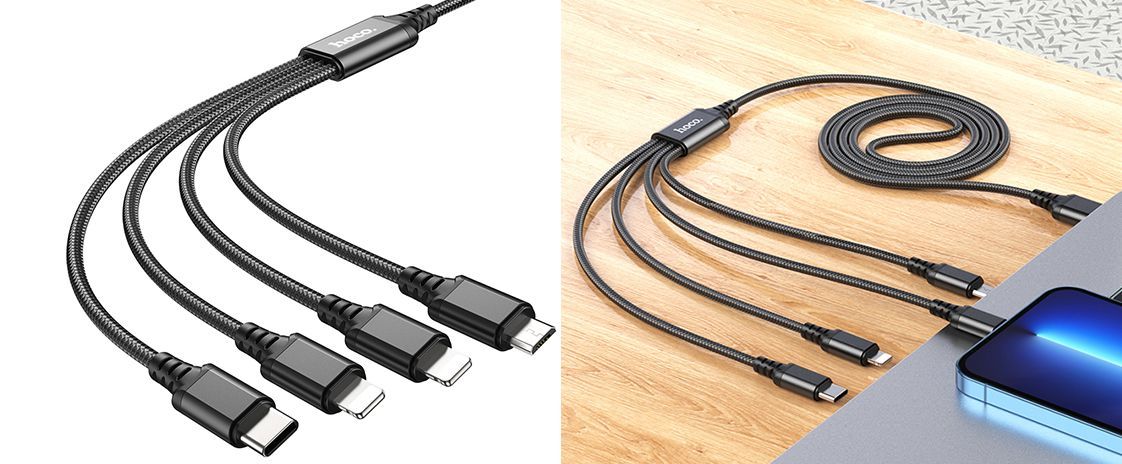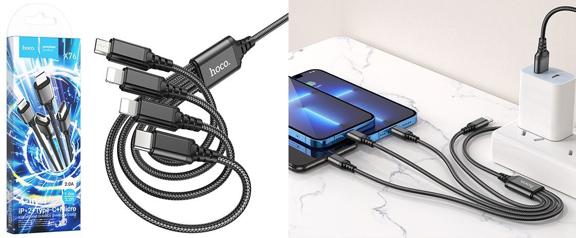 Кабель Hoco X76 4-in-1 - це універсальний аксесуар, призначений для одночасного заряджання до чотирьох пристроїв з різними типами роз'ємів. Оснащений двома конекторами Lightning, одним Type-C та одним Micro-USB, що забезпечує сумісність із широким спектром сучасних гаджетів, включаючи пристрої Apple, Android-смартфони, планшети та інші електронні прилади.