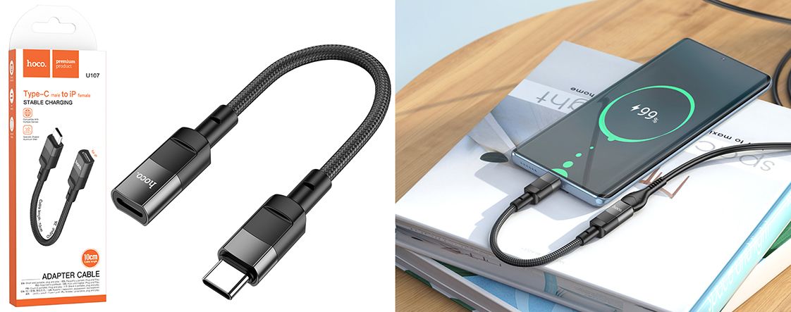 Адаптерний кабель Hoco U107 Type-C male to iP female призначений для заряджання пристроїв із роз'ємом Type-C (female) за допомогою роз'єму Lightning (male). Він має сучасний дизайн та високу якість матеріалів, що забезпечує довгий термін служби та безпечну зарядку.