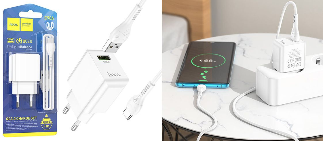 Мережевий зарядний пристрій Hoco C98A виконаний в ультрасучасному дизайні та відрізняється ергономічною конструкцією. Воно не займе багато місця в сумці і може заряджати сумісні моделі смартфонів у прискореному режимі з вихідною потужністю до 18 Вт завдяки підтримці стандарту швидкої зарядки QC3.0/QC2.0 тощо.