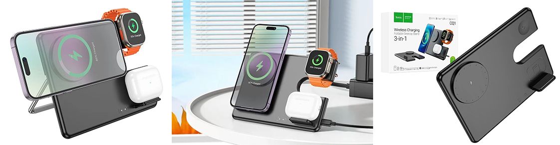 - Унікальна бездротова зарядна станція Hoco CQ1 пропонує неперевершену зручність, дозволяючи одночасно заряджати до трьох пристроїв: iPhone, Apple Watch та AirPods.- Потужність 15 Ватт гарантує швидку та ефективну зарядку вашого смартфона, навушників та розумного годинника.
