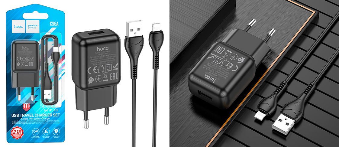 Мережевий Зарядний Пристрій Hoco C96A 1USB/2.1A + (USB - Lightning) (Чорний)