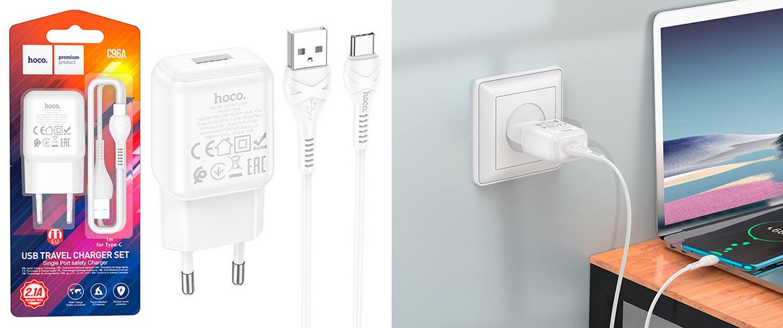 Мережевий Зарядний Пристрій Hoco C96A 1USB/2.1A + (USB - Type-C) (Білий)
