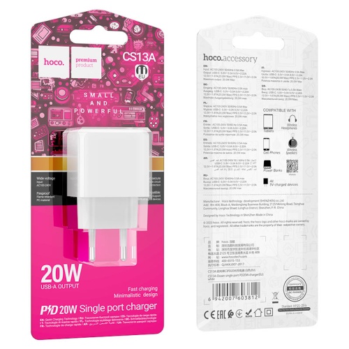 Мережевий зарядний пристрій Hoco CS13A PD20W – це сучасне та безпечне рішення для швидкого заряджання ваших мобільних пристроїв. Виготовлений з PC та ABS, які забезпечують високу міцність і довговічність пристрою. Завдяки підтримці технології PD (Power Delivery) з потужністю 20 Вт цей зарядний пристрій здатний швидко заряджати смартфони, планшети та інші пристрої з портом Type-C. Компактний розмір та стильний дизайн роблять Hoco CS13A ідеальним вибором для подорожей та повсякденного використання. Він гарантує безпеку вашого пристрою, запобігаючи перегріву та короткому замиканню під час заряджання.