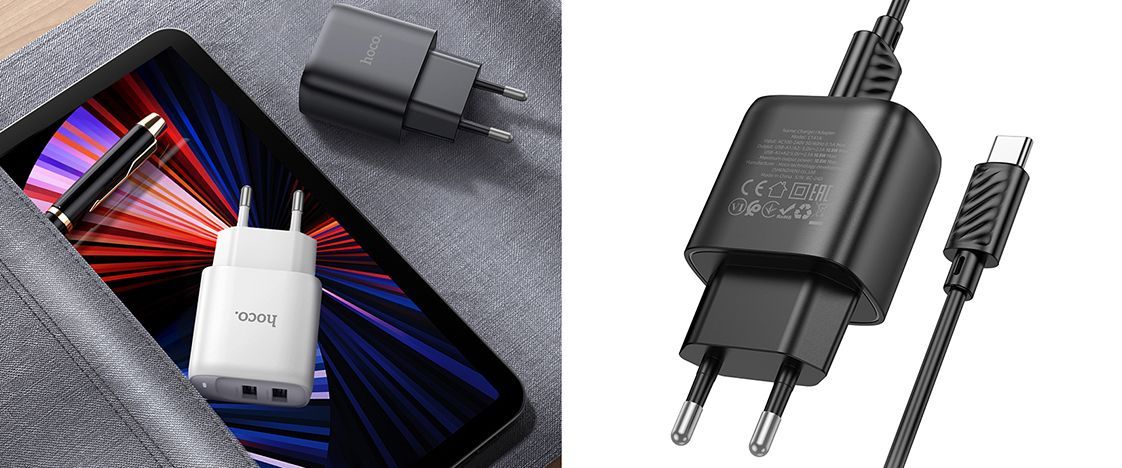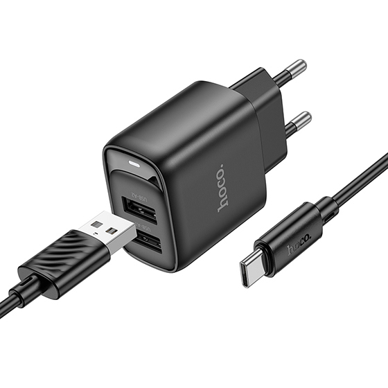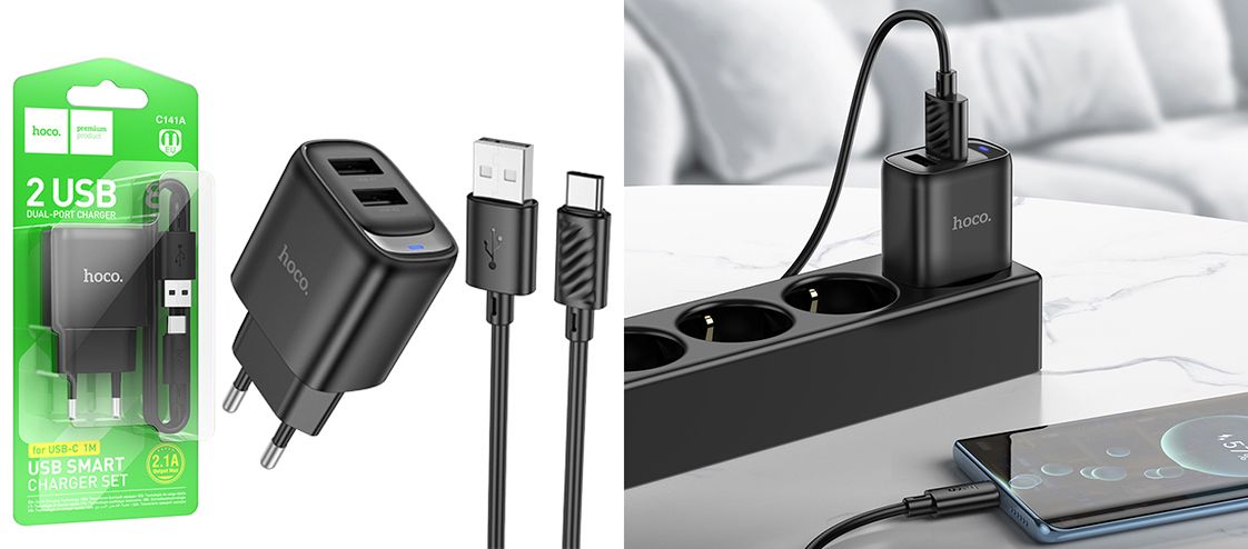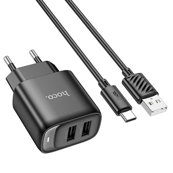 Мережевий Зарядний Пристрій Hoco C141A Smart dual-port charger set 2USB/2.1A + (USB - Type-C) (Чорний)