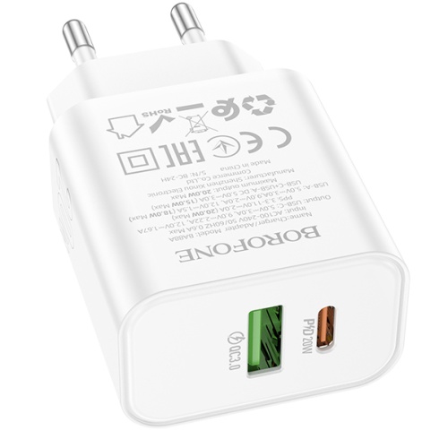 Мережевий Зарядний Пристрій Borofone BA88A 1USB/18W/QC3.0 + 1Type-C/20W/PD (Білий)