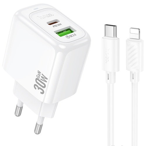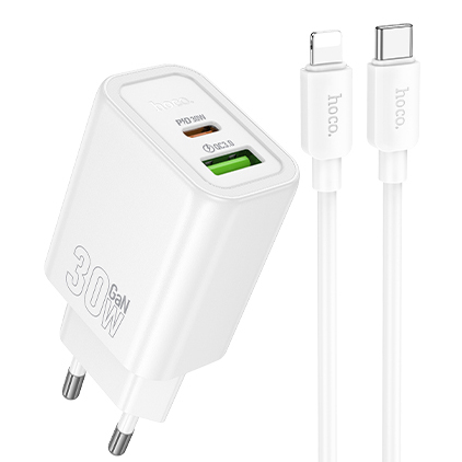 Мережевий Зарядний Пристрій Hoco N63 1USB/18W/QC3.0 + 1Type-C/30W/PD + (Type-C - Lightning) (Білий)