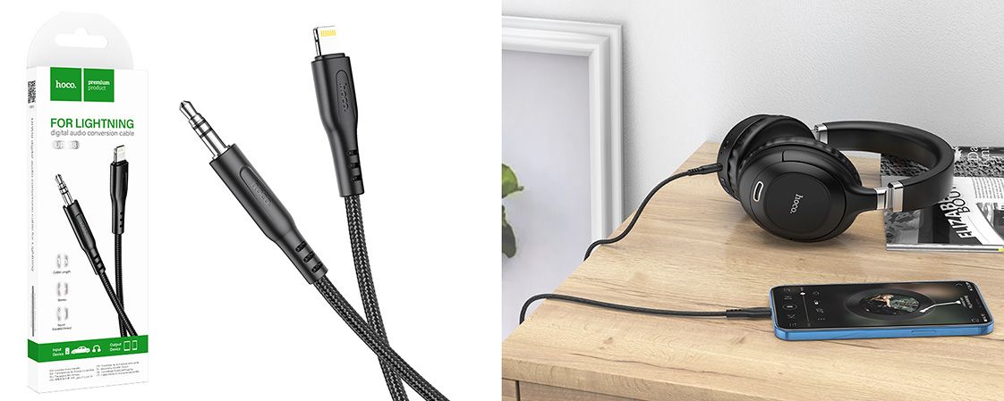 Кабель Lightning на 3,5 mini jack Hoco UPA18 є кабелем з двома роз'ємами: Lightning і mini jack 3,5 мм. Кабель призначений для підключення пристроїв із роз'ємом Lightning (наприклад, iPhone або iPad) до пристроїв із роз'ємом mini jack 3,5 мм (наприклад, навушники або аудіосистеми).