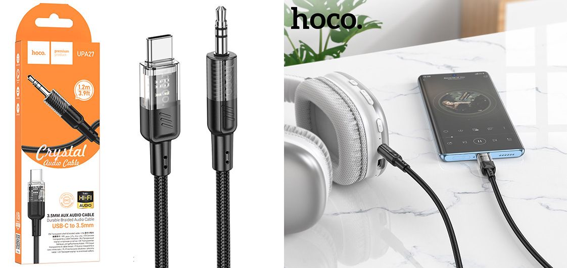 AUX-кабель Hoco UPA27 призначений для підключення пристроїв з роз'ємом Type-C до навушників, динаміків або інших аудіопристроїв із входом 3.5 мм. Він забезпечує надійну передачу аудіосигналу, що дозволяє комфортно використовувати навушники або акустичні системи із сучасними смартфонами, які не мають стандартного аудіороз'єму.