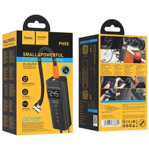 Автомобільний компресор Hoco PH55 здатний накачати не тільки автошини, але також колеса мотоцикла/велосипеда, спортивні м'ячі та інші надувні предмети. Корпус з ABS-пластику високої міцності оснащений цифровим РК-дисплеєм із 3 одиницями вимірювання тиску.