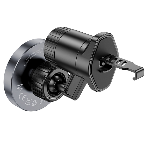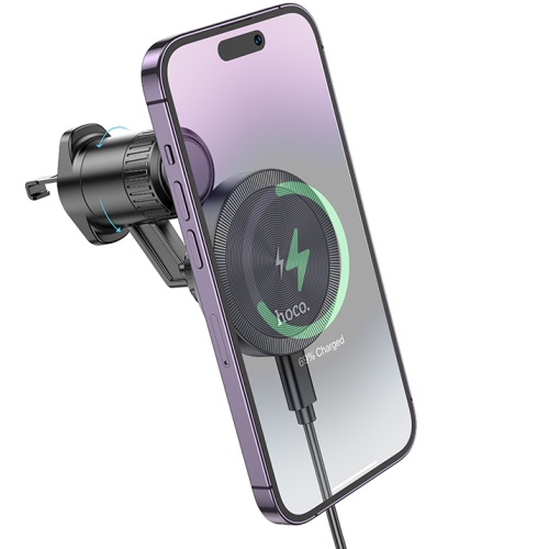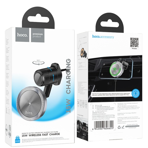 Автомобільний тримач із бездротовою зарядкою Hoco HW6 забезпечує надійне та зручне кріплення вашого смартфона в автомобілі. Виготовлений із довговічного ABS-пластику, полікарбонату та алюмінієвого сплаву, цей тримач пропонує чудову стійкість до зносу та зовнішніх впливів. Магнітне утримання гарантує, що ваш гаджет залишиться на місці навіть на нерівних дорогах. Спеціально розроблена гумова поверхня не тільки запобігає ковзанню пристрою, але й захищає його корпус від подряпин. Місце кріплення на дефлекторі вибрано таким чином, щоб не затуляти огляд водія, а можливість повороту на 360 градусів дозволяє легко регулювати кут огляду смартфона для максимального комфорту. Підтримка бездротової зарядки потужністю до 15 Вт дозволяє швидко заряджати ваш пристрій без зайвих дротів. У комплект також входить магнітне кільце, що забезпечує фіксацію смартфона без MagSafe.