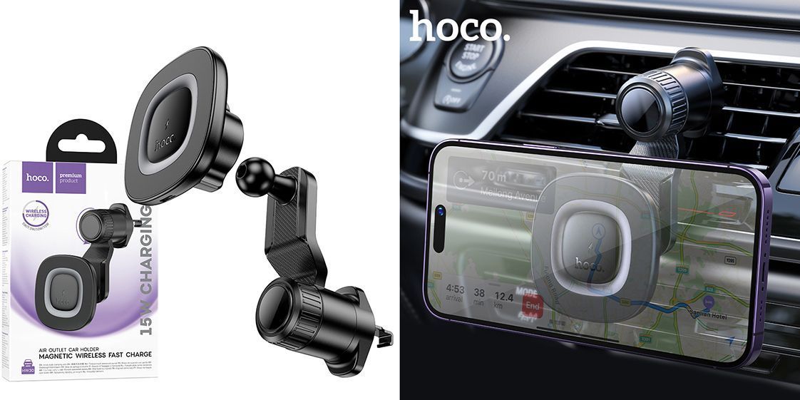 Автомобільний тримач Hoco HW30 — це зручний аксесуар, який поєднує в собі міцне магнітне кріплення та бездротову зарядку потужністю до 15Вт. Створений спеціально для комфортного використання смартфона в авто, він кріпиться до повітроводу за допомогою надійної кліпси. Завдяки сильному магніту типу N52, тримач впевнено утримує навіть великі телефони, включаючи моделі з MagSafe.