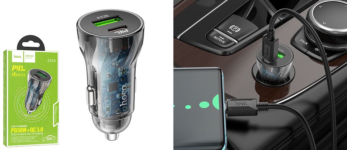 Автомобільний Зарядний Пристрій Hoco Z47A Transparent 1USB/18W/QC3.0 + 1Type-C/30W/PD (Прозорий чорний)
