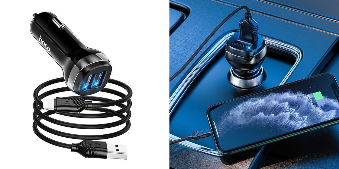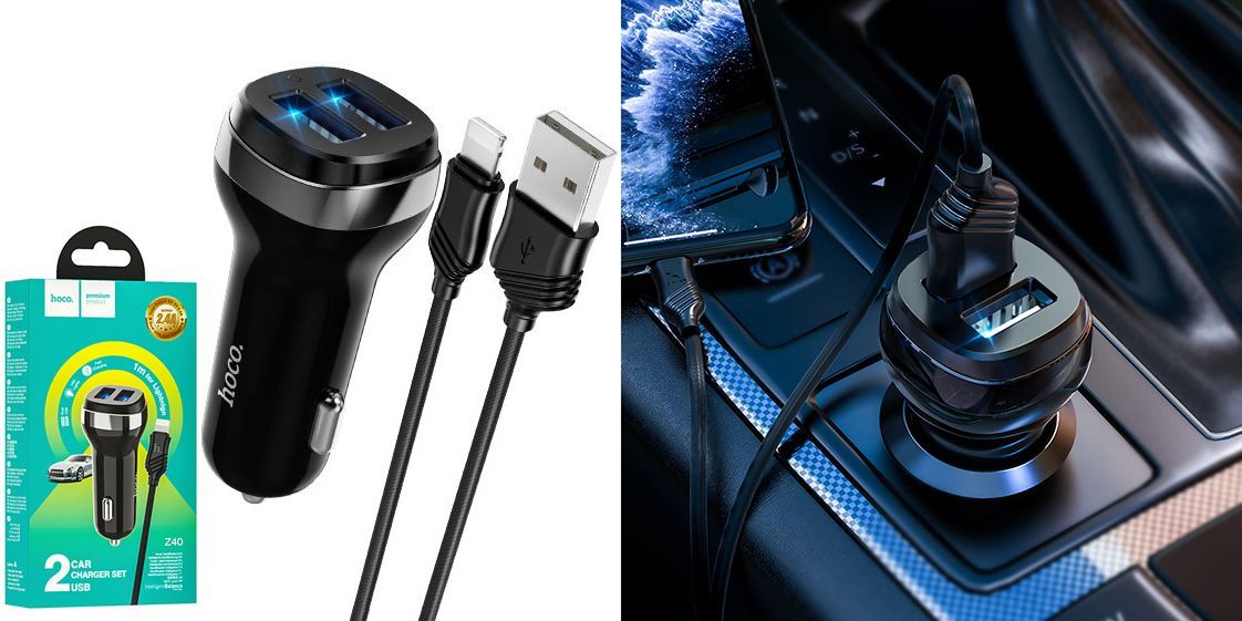 Автомобільний Зарядний Пристрій Hoco Z40 2USB/2.4A + (USB - Lightning) (Чорний)