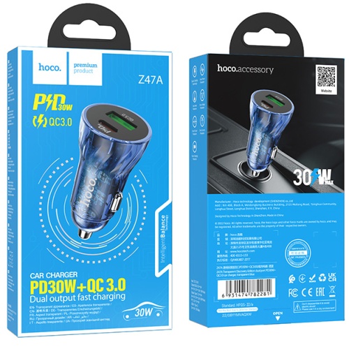 Автомобільний Зарядний Пристрій Hoco Z47A Transparent 1USB/18W/QC3.0 + 1Type-C/30W/PD (Прозорий синій)