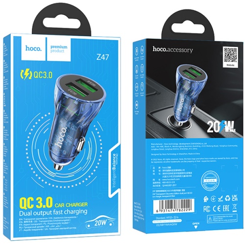 Автомобільний Зарядний Пристрій Hoco Z47 Transparent 2USB/20W/QC3.0 (Прозорий синій)