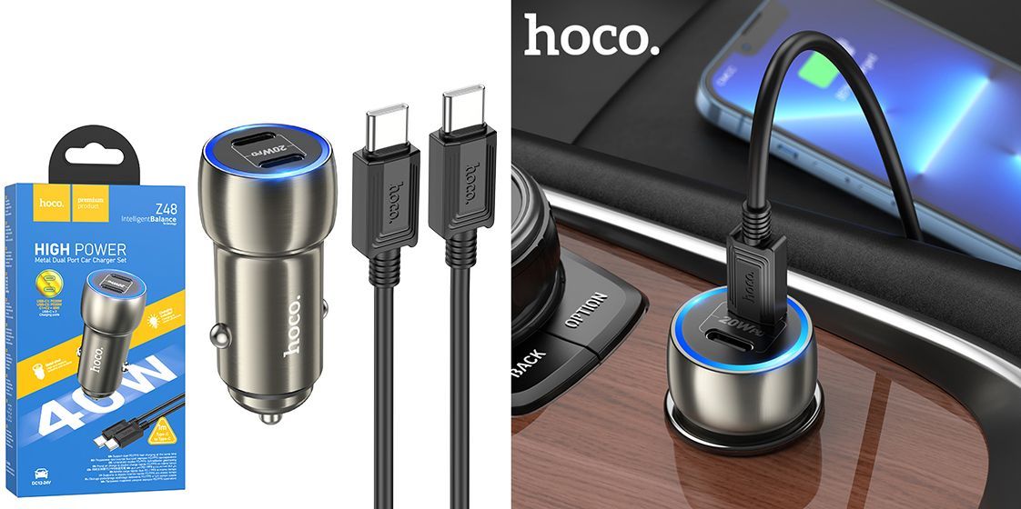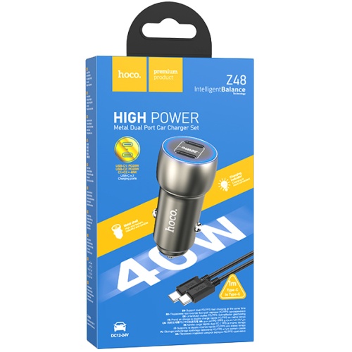 Автомобільний Зарядний Пристрій Hoco Z48 2Type-C/20W/PD + (Type-C - Type-C) (Металево-сірий)