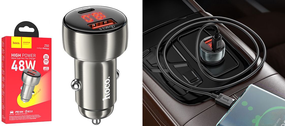 Hoco Z50 – це сучасний зарядний пристрій, який поєднує високу потужність, інноваційні технології та зручність використання. Оснащений одним портом USB-A (18W) і одним портом Type-C (30W), він забезпечує швидку зарядку для двох пристроїв одночасно із загальною потужністю до 48W. Цифровий дисплей, підтримка швидкої зарядки PD/QC і протиковзка конструкція роблять цей адаптер ідеальним вибором для водіїв, які цінують ефективність і контроль.