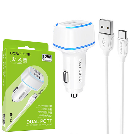Автомобільний Зарядний Пристрій Borofone BZ14 2USB/2.4A + (USB - Type-C) (Білий)
