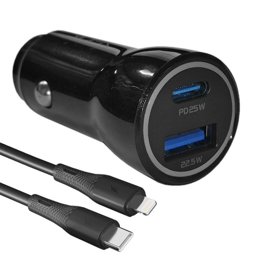 Автомобільний Зарядний Пристрій Ridea RCC-47115 QPow Pro 1USB/1USB-C PD/QC 47.5W+Type-C to Lightning (Чорний)