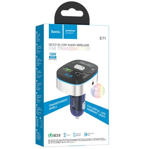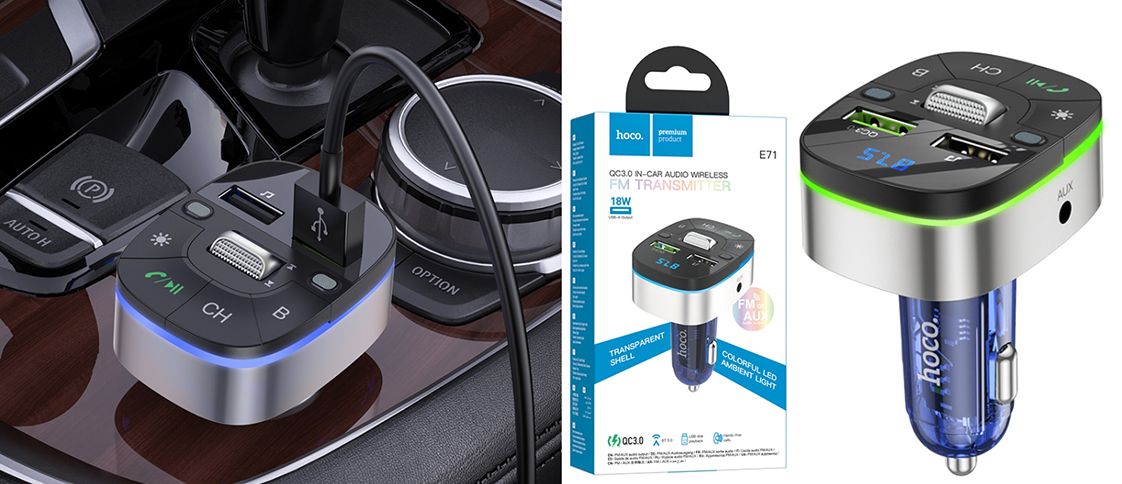 HOCO E71 також оснащений функцією швидкої зарядки, що дозволяє заряджати відразу три гаджети. Один із USB-портів підтримує програвання музики з флеш-накопичувачів. Модулятор підтримує різні протоколи швидкої зарядки, такі як QC, FCP, AFC, забезпечуючи ефективну та швидку зарядку ваших пристроїв. Крім того, пристрій має вбудований захист від короткого замикання, перепадів напруги та перегріву, забезпечуючи безпеку використання.