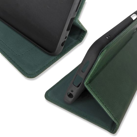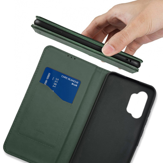 Стильний чохол-книжка Leather Fold для телефону моделі Samsung A135 Galaxy A13 виготовлено з високоякісної еко-шкіри темно-зеленого кольору, яка по зовнішньому вигляду майже не відрізняється від натуральної шкіри.