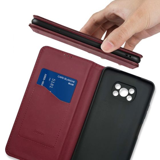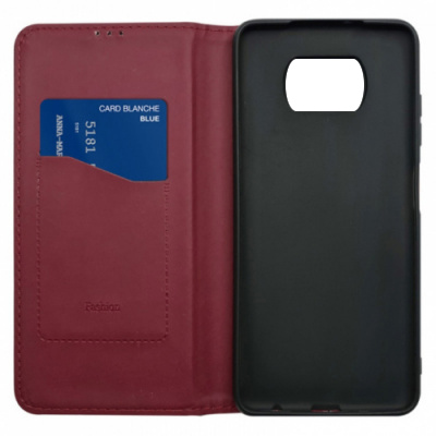 Стильний чохол-книжка Leather Fold для телефону моделі Xiaomi Poco X3/Xiaomi Poco X3 Pro виготовлено з високоякісної еко-шкіри темно-червоного кольору, яка по зовнішньому вигляду майже не відрізняється від натуральної шкіри.