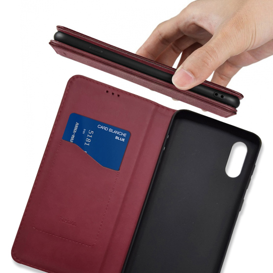 Стильний чохол-книжка Leather Fold для телефону моделі Xiaomi Redmi 9A виготовлено з високоякісної еко-шкіри темно-червоного кольору, яка по зовнішньому вигляду майже не відрізняється від натуральної шкіри.