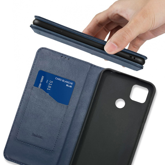Стильний чохол-книжка Leather Fold для телефону моделі Xiaomi Redmi 9C виготовлено з високоякісної еко-шкіри темно-синього кольору, яка по зовнішньому вигляду майже не відрізняється від натуральної шкіри.
