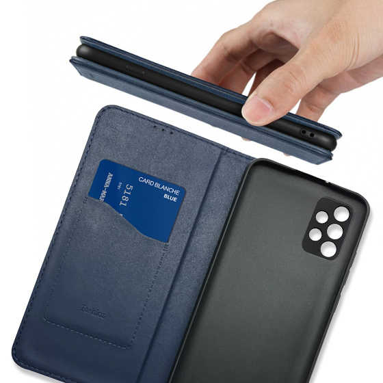 Стильний чохол-книжка Leather Fold для телефону моделі Samsung A725 Galaxy A72 виготовлено з високоякісної еко-шкіри темно-синього кольору, яка по зовнішньому вигляду майже не відрізняється від натуральної шкіри.