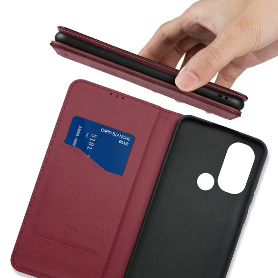 Стильний чохол-книжка Leather Fold для телефону моделі Motorola E20 виготовлено з високоякісної еко-шкіри темно-червоного кольору, яка по зовнішньому вигляду майже не відрізняється від натуральної шкіри.