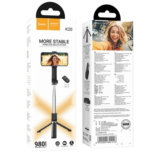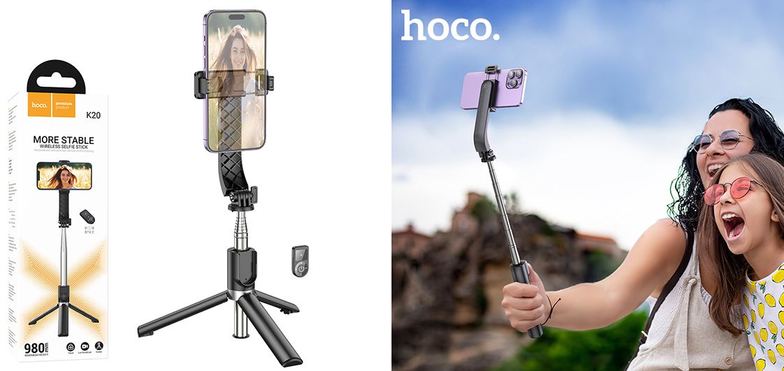 Монопод штатив-трипод Hoco K20 з пультом для селфі - монопод для селфі універсальний, дозволяє брати з собою і робити селфі та групові фотографії. Сумісний з iOS, Android. Телефон можна розташувати у вертикальному та горизонтальному положенні. Розсувний механізм монопода має сім положень, кожне фіксується. За допомогою пульта дистанційного керування Bluetooth можна робити групові фотографії. Робочий діапазон пульта дистанційного керування: <10м.